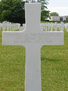 The 80th Infantry Divison pushed forward and in the next days they attacked the area of Clervaux and Wiltz in Luxembourg. By 23 January 1945 they left both towns behind them, however Charles Weisenberger wasn't with them anymore. Charles was wounded while attacking enemy positions. He died hours later.Pfc Charles A. Weisenberger is remembered at Saint Joseph Catholic Church Cemetery in Gluckstadt, Madison County, Mississippi.