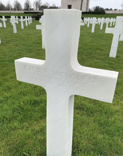 Pfc Cecil R. Nichols Sr. enlisted at Fort McPherson, Georgia on 25 April 1944.Source of information: Peter Schouteten, www.abmc.gov, www.wwiimemorial.com – Gilbert G. Nichols, www.archives.gov – WWII Enlistment Record, www.ancestry.com - Headstone and Interment Record / Sara Rouse Family Tree / 1940 Census, http://www.45thdivision.org
