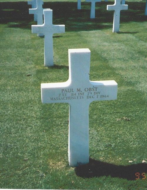 2nd Lt Paul M. Obst graduated from Naugatuck High School and from North Carolina State College and was employed at the Coca Cola Bottling Company of Worcester before he enlisted at Fort Devens, Massachusetts on 16 January 1943. He was sent overseas in September 1944.He was first buried at the Temporary American Military Cemetery in Hochfelden, France.