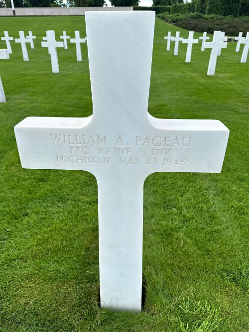 Pfc William A. Pageau enlisted at Ft. Sheridan, Illinois on 2 August 1944. He worked in a machineshop before he enlisted.He was first buried in the Limey Cemetery, Toul, France.