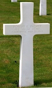 Pvt Robert E Palmer enlisted at Fort MacArthur, California on 1 March 1944.Source of information: André Koch, www.abmc.gov, www.wwiimemorial.com, www.archives.gov – WWII Enlistment Record, www.ancestry.com - 1930/1940 Census / Headstone and Interment Records / U.S. WWII Draft Cards Young Men, 1940-1947, http://www.89infdivww2.org