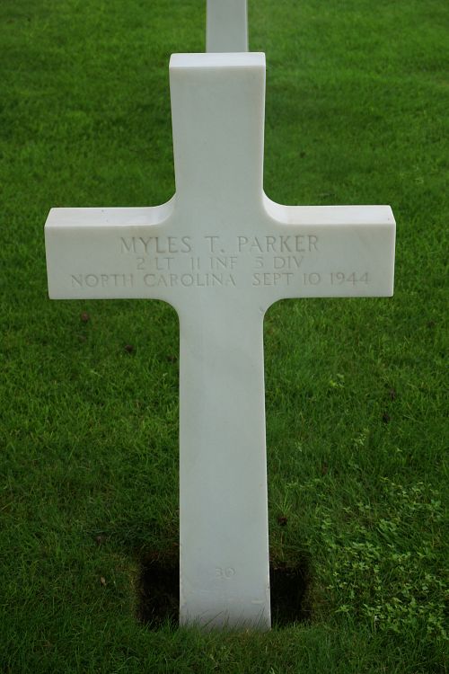 2nd Lt Myles T. Parker attended high school for 4 years before he enlisted in the National Guard at Camp Butner, Durham, North Carolina.He was first buried in the Saint James Cemetery, Saint James, France.