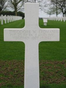 Pvt Theodore W. Erdman attended the rural schools in Mosel and following his marriage to Ethel Mae Metzger, Manitowoc, on Oct. 27, 1928 at Haven, came to Sheboygan to make his home. He was employed as a deliveryman at the H. C. Prange company for 17 years, and prior to his induction was an employe of the Curt Joa company, Sheboygan Falls. He was an active member of the International Brotherhood of Teamsters and a member of the Evangelical Lutheran church in the town of Mosel.Pvt Erdman was inducted into the Army on Dec. 23, 1943, and upon completion of basic and advanced training at Fort Knox, Ky., Camp Campbell, Ky., and Fort Meade, Md., left for overseas service in July 1944. After an additional month of instruction in England, he joined Allied armies in Holland. He was killed in action there one month later while participating in battle with an armored division of the 23rd infantry.