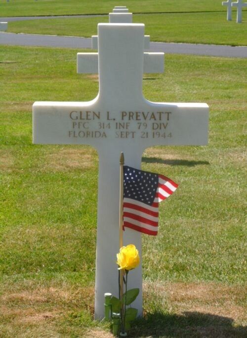 Pfc Glen L. Prevatt Jr. was employed at the Hayworth Construction Company before he enlisted at Camp Blanding, Florida on 28 August 1943.He was killed by artillery shell fragments to his chest.