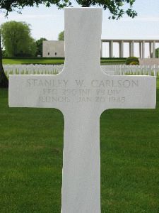 Stanley Carlson was sent overseas in May 1944 and arrived at the frontline in January 1945.Source of information: Peter Schouteten, Terry Hirsch, National WWII Memorial, National Archives, www.rrstar.com, www.ancestry.com - U.S., Headstone and Interment Records for U.S. Military Cemeteries on Foreign Soil, http://75thdivisiondad.com