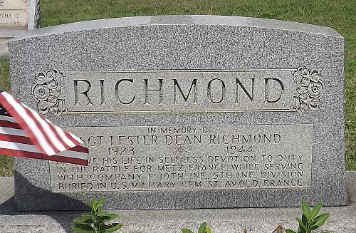 Sgt Lester D. Richmond was a welder before he enlisted in Clarksburg, West Virginia on 12 May 1943.At the time of his death, the 10th Infantry Regiment was engaged in the vicinity of Courcelles-sur-Nied, France.