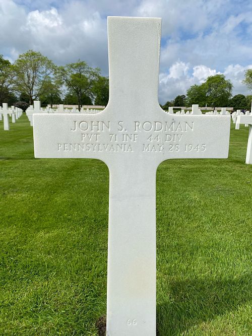 Pvt John S. Rodman was employed at the National Tube Company before he enlisted in Pittsburgh, Pennsylvania on 4 September 1944.Source of information: Peter Schouteten, Kathy McDermott, www.abmc.gov, www.wwiimemorial.com – A Grateful American, www.archives.gov – WWII Enlistment Record, www.ancestry.com - Headstone and Interment Record / U.S. WWII Draft Cards Young Men / Pennsylvania Veteran Compensation Application Files WWII, www.findagrave.com - Marie