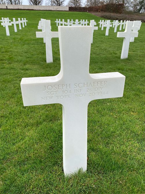 Sgt Joseph P. Schaefer was employed at the Schieffelin Drug Company before he enlisted at Camp Upton, New York on 28 January 1942.He was first buried at the Temporary American Military Cemetery in Limey, France.
