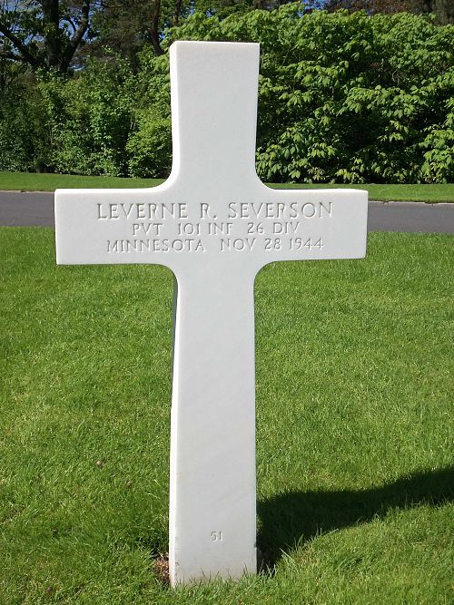 Pvt Leverne R. Severson attended high school for four years and was employed at the Farrell Contracting Company before he enlisted at Fort Snelling, Minnesota on 23 May 1944.He was killed by small arms fire in his chest.