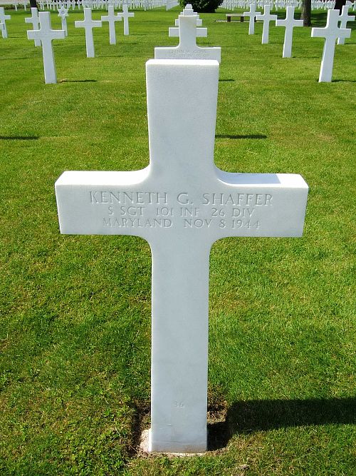 S/Sgt Kenneth G. Shaffer attended high school for three years and was a miner before he enlisted at Fort George G. Meade, Maryland on 6 February 1942.He was first buried at the Temporary American Military Cemetery in Limey, France.