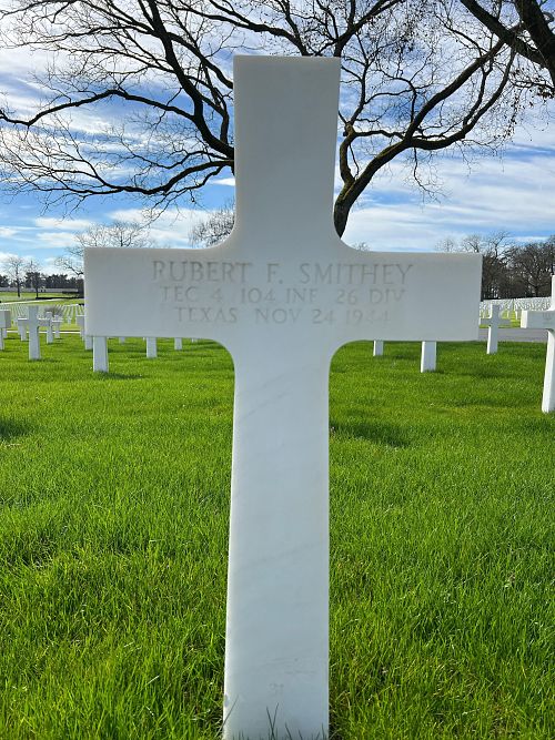 T/4 Rubert F. Smithey was employed at the R. L. Myers Milk Route before he enlisted in 1943.He was first buried at the Temporary American Military Cemetery in Limey, France.