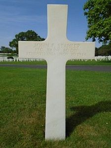 Pfc John F. Stahler attended high school for four years and worked in a machine shop before he enlisted at Fort George G. Meade, Maryland on 5 June 1941. He was sent overseas on 23 April 1944.He died of wounds in the neck caused by artillery shell and blast fragments.