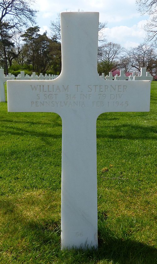 S/Sgt William T. Sterner graduated from Schuylkill Haven High School and was a welder and flame cutter before he enlisted in Allentown, Pennsylvania on 20 March 1943. He was sent overseas in June 1944.He was reported wounded in action on 16 October 1944. He sustained wounds in his back from artillery shell fragments. For this wound he was awarded the Purple Heart Medal a first time.