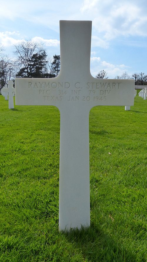 Pfc Raymond C. Stewart was a driver at the Santa Rosa Ice Company before he enlisted in Lubbock, Texas on 18 August 1943.As his unit had to withdraw from Hatten and Ritterhoffen to a new position south of Haguenau, France on 19 January 1945, Pfc Stewart was reported missing in action. When his remains were found and identified his date of death was declared as 20 January 1945.
