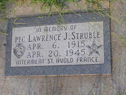 Pfc Lawrence J. Struble is also remembered at the Gypsum Hill Cemetery in Salina, Saline County, Kansas.Source of information: Peter Schouteten, www.abmc.gov, www.wwiimemorial.com, www.ancestry.com - Headstone and Interment Record, www.findagrave.com - Have Paws will travel, http://14thad.org