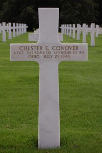 S/Sgt Chester E. Conover was a chauffeur before he enlisted in Cincinnati, Ohio on 14 October 1942.Two small islands off the coast, which were home to two German fighter bases, were bombed. Leading the mission was Maj Ray Ketelson. He described the results of the bombing as uncertain, but did report seeing at least five fires burning through the smoke. Enemy fighters were out in force, and a running battle didn't give crews much time for sightseeing. They were aggressive and effective, as they brought down one B-17. The aircraft, piloted by Lt James R. Roberts, was shot down by enemy fighters. Three men were killed, and the rest of the crew was taken prisoner.