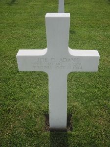 Pvt Joe C. Adams enlisted in Richmond, Virginia on 26 April 1943 and was sent overseas on 2 July 1944. After being in the UK for some time he arrived in France on 8 September 1944.He was killed by artillery sharpnel.
