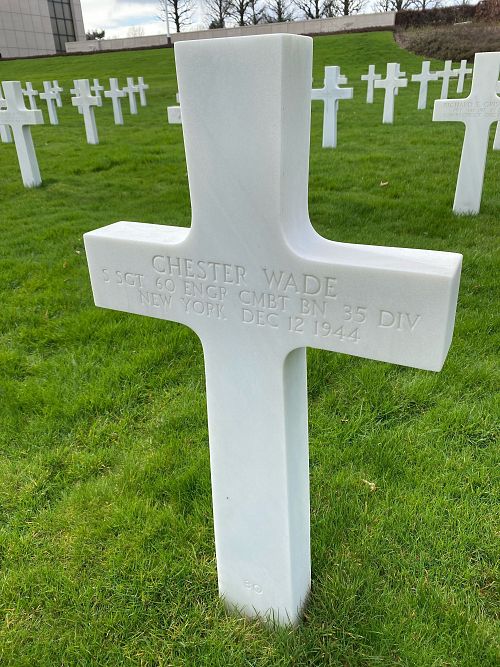 S/Sgt Chester Wade attended high school for four years and was a bookkeeper and cashier before he enlisted in New York City, New York on 6 February 1943.He was awarded the Silver Star Medal Posthumously. The citation cited: Near Sarreinsming, France on 12 December 1944. When his platoon was forced to abandon its task of constructing an infantry foot bridge across the **** River because of intense enemy small arms fire, Sgt Wade successfully reorganized his unit in defensive positions to ward off impending counterattacks. Some of our infantry had established a bridgehead on the hostile shore, and it was vitally necessary that their efforts were reinforced and the bridge completed so that more troops could accomplish the crossing. The engineer platoon engaged the enemy in a fierce fire fight, during which Sgt Wade walked up and down behind his men without seeking cover or concealment for himself, pointing out targets and firing at the Germans. While thus engaged, he was struck by an enemy bullet and killed. His inspiring leadership was directly responsible for the successful completion of the platoon mission and the repulse of the enemy reflects the highest credit upon his character and training as a soldier.