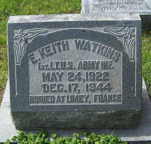 1st Lt Eugene K. Watkins attended high school for four years and was a photographic processor before he joined the National Guard in Camp Patrick Henry Newport News, Virginia on 3 February 1941.He was first buried at the Temporary American Military Cemetery in Limey, France.