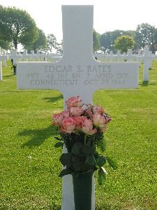 Pvt Edgar S. Bates was an attendant at a filling station before he enlisted at Fort Devens, Massachusetts on 22 March 1944.He was first buried in a temporary grave at Margraten on 27 November 1944. He was disinterred on 14 July 1948 and his remains were prepared and placed in a casket on 15 July 1948. Pvt Bates was given his final resting place on 6 January 1949.