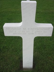T/4 Monroe M. Kretschmer was first buried at Temporary American Military Cemetery Henri-Chapelle, Belgium Block Q, Row 5, Grave 86.