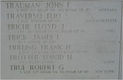 After graduating at Spencerport High School, Robert True was employed by the International Business Machines Corporation as a payroll clerk and timekeeper. He enlisted in Rochester on 14 September 1942.The airplane was hit by flak over the target, knocking out #2 engine. Oil vapor came out the #2 nacelle and the propeller was windmilling. also #1 engine was hit and was feathered. It kept up with the formation for about ten minutes and then dropped out and was observed to be losing altitude. Later the plane was attacked by German fighters, hitting it near the cockpit.