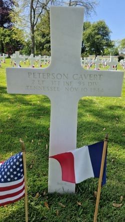 2nd Lt Peterson Cavert enlisted at Fort Oglethorpe, Georgia on 19 September 1942. Member of an infantry outfit serving with Gen. George Patton's Third Army, Lieutenant Cavert had been transferred from an antitank division tot he infantry. A native of Nashville, he was educated at Webb School, Bell Buckle, and at Davidson College, Davidson, N.C.He was an elevator operator before he enlisted.