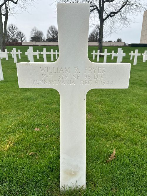 Pvt William R. Fryer enlisted in New Cumberland, Pennsylvania. on 31 May 1944. He attended high school for 3 years and was a driver before he enlisted.He was initially buried in the Temporary American Military Cemetery Limey, France.