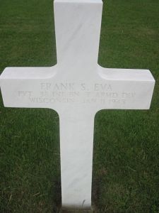 Frank Eva was the victim of an accident in Awan, Belgium on 2 January 1945.He died in the 128th Evacuation Hospital, which was stationed in Verviers, Belgium.
