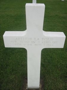 Pvt Arthur La Tour attended Mount Assumption Insititute and worked for the Plattsburgh Ice Company. He enlisted on 13 March 1942 and was sent to Camp Polk, Louisiana and Fort Benning, Georgia. He was went overseas in April 1944.He is commemorated on a monument unveiled in Ospel, the Netherlands on 6 November 2019 in memory of the American soldiers who fell during the liberation of the town.