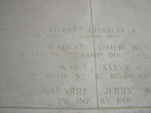 Omer Nadeau enlisted on 16 September 1940.He was reported missing in action on 15 April 1945 when his Company was part of a Task Force of tanks and infantry making an attack on an enemy position. His tank was on the lead platoon when it encountered a heavy artillery barrage. The Infantry dismounted from the tanks to seek cover. The platoon kept moving forward and later when it was being reorganized, Pvt Nadeau was not present.
