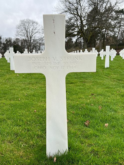 Pvt Joseph V. Strunk enlisted in Cleveland, Ohio on 10 December 1943.He attended high school for 2 years and was a retail manager for Tom McAnn shoe store.