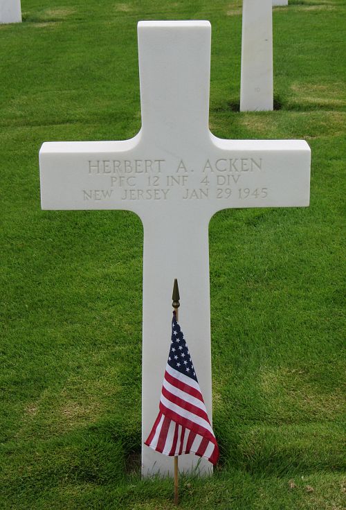 Pfc Herbert A. Acken attended high school for 4 years and was a statistical clerk before he enlisted at Fort Dix, New Jersey on 20 May 1944.Source of information: Peter Schouteten, Danny van der Groen – Company’s / 4ID After Action Reports, www.abmc.gov, www.wwiimemorial.com, www.archives.gov – WWII Enlistment Record, www.ancestry.com - Headstone and Interment Record / Bevis Family Tree / New Jersey Church Records, www.findagrave.com