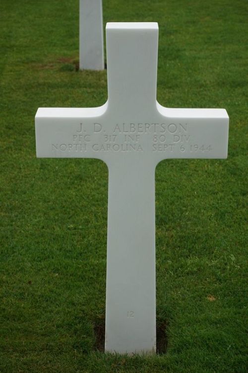Pfc John D. Albertson III worked on a farm before he enlisted at Fort Bragg, North Carolina on 17 July 1942. He was sent overseas in June 1944.Source of information: Leo Minne, www.abmc.gov, www.wwiimemorial.com, www.ancestry.com – 1940 Census / Headstone and Interment Record / Cole Albertson Story Marlow Family Tree / U.S. Draft Cards Young Men, www.80thDivision.com, www.findagrave.com