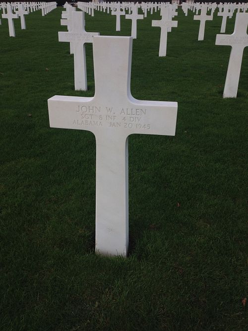 Sgt John W. Allen enlisted at Fort McClellan, Alabama on 24 February 1943. He was sent overseas in April 1944.Source of information: Peter Schouteten, 4ID After Action Reports, www.abmc.gov, www.wwiimemorial.com, www.archives.gov – WWII Enlistment Record, WWII Draft Card
