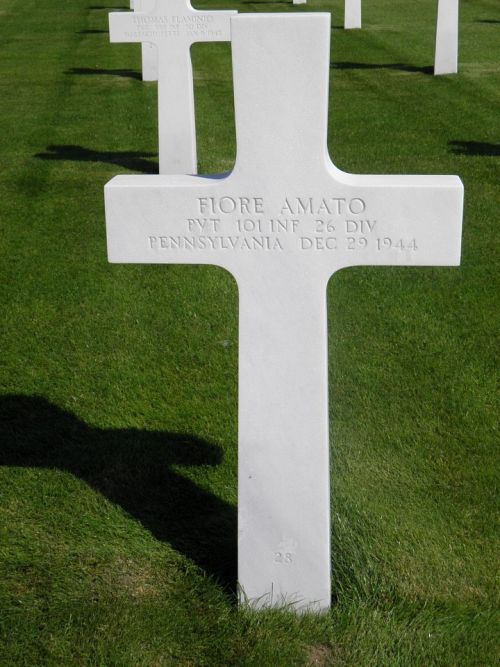 Pvt Fiore Amato was a carpenter apprentice before he enlisted at Camp Lee, Virginia on 9 March 1942.Source of information: Peter Schouteten, www.abmc.gov, www.wwiimemorial.com, www.archives.gov – WWII Enlistment Record, www.ancestry.com - Headstone and Interment Record / Pennsylvania Veteran Compensation Application Files WWII / 1930 Census, www.findagrave.com – a2, www.fold3.com – 26th Infantry Division