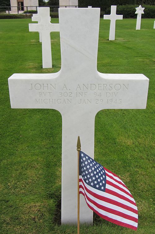 Pvt John A. Anderson enlisted at Fort Sheridan, Illinois on 10 August 1944.Source of information: Peter Schouteten, www.abmc.gov, www.wwiimemorial.com, www.archives.gov – WWII Enlistment Record, www.ancestry.com - Headstone and Interment Record, http://www.94thinfdiv.com, WWII Draft Card