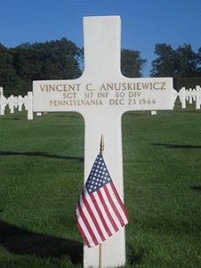 Sgt Vincent C. Anuskiewicz worked at Eagle Mill and as a lineman at the Pennsylvania Power and Light Company.Source of information: Leo Minne, www.abmc.gov, www.wwiimemorial.com, www.ancestry.com –1930/1940 Census / Headstone and Interment Record / U.S. Draft Cards Young Men, www.findagrave.com, www.80thdivision.com