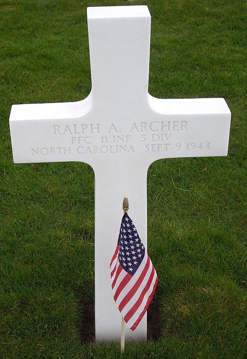Pfc Ralph A. Archer was a sales clerk before he enlisted at Camp Croft, South Carolina on 21 April 1943.Source of information: Leo Minne, www.abmc.gov, www.wwiimemorial.com, www.archives.gov – WWII Enlistment Record, www.ancestry.com – 1930/1940 Census / U.S. Headstone and Interment Record, A footsoldier for Patton / Michael C. Bilder James G. Bilder, The 5th Infantry division in the ETO