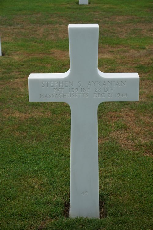 Pvt Stephen S. Aykanian attended high school for four years before he enlisted at Fort Devens, Massachusetts on 31 March 1944.Source of information: Peter Schouteten, Terry Hirsch, www.abmc.gov, www.wwiimemorial.com – Leo Tarpinian, www.archives.gov – WWII Enlistment Record, www.ancestry.com - Headstone and Interment Record / Boornazian Ronga Family Tree, www.findagrave.com, WWII Draft Card