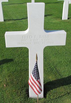Pfc Fred F. Babb attended Attica High School and worked on a farm before he enlisted in Indianapolis, Indiana on 27 November 1943.Source of information: Leo Minne, www.abmc.gov, www.wwiimemorial.com, www.archives.gov – WWII Enlistment Records, www.ancestry.com - 1920/1930/1940 Census / U.S. Headstone and Interment Record / The Master Family Trees/ Indiana Birth Certificates, A footsoldier for Patton / Michael C. Bilder James G. Bilder, The 5th Infantry Division in the ETO
