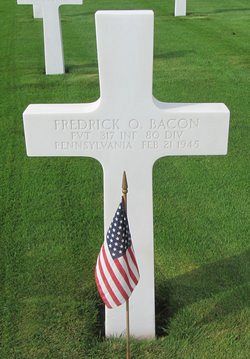 Pvt Frederick O. Bacon was a worker in a steel factory before he enlisted in New Cumberland, Pennsylvania on 26 June 1944.Source of information: Leo Minne, www.abmc.gov, www.wwiimemorial.com, www.ancestry.com – 1930/1940 Census / Headstone and Interment Record / U.S. Draft Cards Young Men / Pennsylvania Veteran Compensation Applications / Pennsylvania Death Certificates, www.80thdivision.com