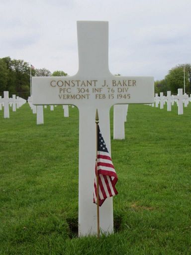 Pfc Constant J. Baker was a graduate of Windsor High School, Windsor, Vermont, and attended Vermont Junior College in Montpelier, Vermont. He was also an outstanding athlete during his high school years, captain of three sports and best remembered for the 1935 Vermont State Football Championship game when he played quarterback without a helmet.He enlisted at Fort Devens, Massachusetts on 26 April 1944.