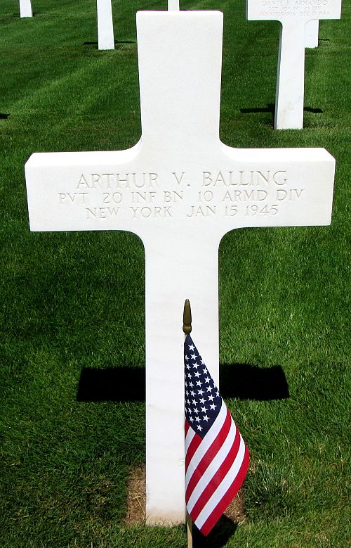 Pvt Arthur V. Balling attended high school for two years and was a driver before he enlisted in New York City, New York on 5 February 1943.Source of information: Peter Schouteten, www.abmc.gov, www.wwiimemorial.com, www.archives.gov – WWII Enlistment Record, www.ancestry.com - Headstone and Interment Record / U.S. WWII Draft Cards Young Men / 1925/1940 Census / New York Marriage License Indexes