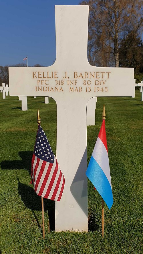 Pfc Kellie J. Barnett was a molder, employed by the International Harvester Co. before he enlisted in Indianapolis, Indiana on 5 June 1943. He was first assigned to the Army Air Corps, before being transferred to the infantry.He was killed by artillery shell fragments which hit him in the face and the thorax.