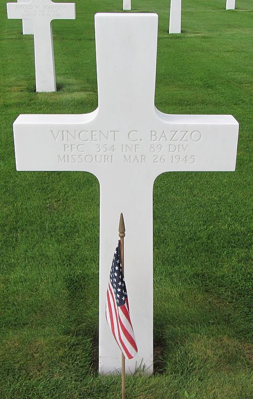 Pfc Vincent C. Bazzo enlisted at Jefferon Barracks on 24 May 1943.Source of information: André Koch, www.abmc.gov, www.wwiimemorial.com, www.archives.gov – WWII Enlistment Record, www.ancestry.com - 1920/1930/1940 Census / U.S. WWII Draft Cards Young Men, 1940-1947 / Headstone and Interment Record, http://www.89infdivww2.org