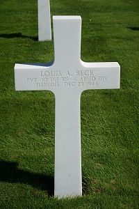 Louis Beck was first buried at the Temporary American Military Cemetery of Grand Failly, France.Source of information: André Koch, Terry Hirsch, Hannah Majewski, www.abmc.gov, www.wwiimemorial.com, www.archives.gov - WWII Enlistment Record, www.ancestry.com - Headstone and Interment Record / 1940 Census / WWII Draft Card