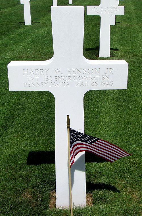 Pvt Harry W. Benson Jr. graduated from Susquehanna High school and attended Drexel Institute for one year before he enlisted in Wilkes-Barre, Pennsylvania on 29 September 1943. He was sent overseas in 1944.Information received by his parents from the Lieutenant commanding his company, was that Pvt Benson was last seen crossing the Rhine River. The War Department notified his parents that he left St. Goar, Germany about 2 o'clock on the morning of his death.