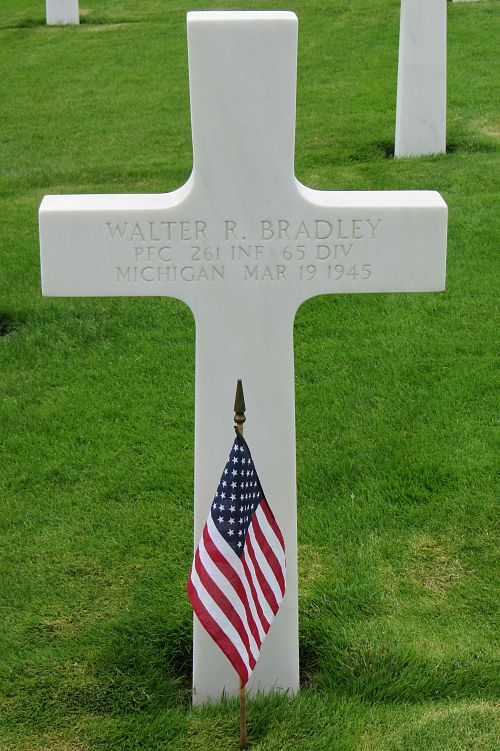 Pfc Walter R. Bradley attended Northwestern High School and was employed at Fisher Body as a purchasing agent. He was married to Frances E. Johnson on 28 October 1943.Source of information: Nick Lieten, www.abmc.gov, www.wwiimemorial.com, www.ancestry.com - Michigan marriage records / Headstone and Interment Record / Family Tree, www.65thdiv.com