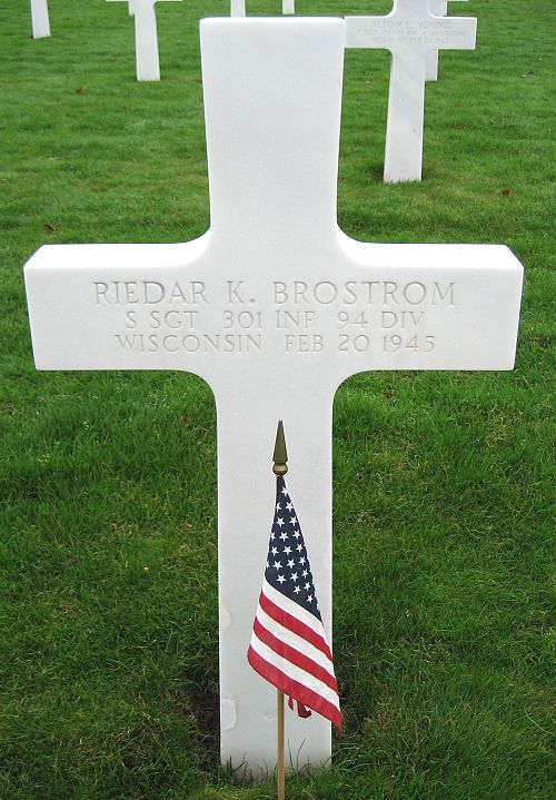 S/Sgt Riedar K. Brostrom attended West High School and was employed at Fardy's Grocery before he volunteered for the U.S. Army in Milwaukee, Wisconsin on 11 December 1942. He was sent overseas in August 1944.Source of information: Peter Schouteten, www.abmc.gov, www.wwiimemorial.com, www.archives.gov – WWII Enlistment Record, www.ancestry.com - Headstone and Interment Record / 1930 Census / Lynghamer Mason Family Tree, http://www.94thinfdiv.com